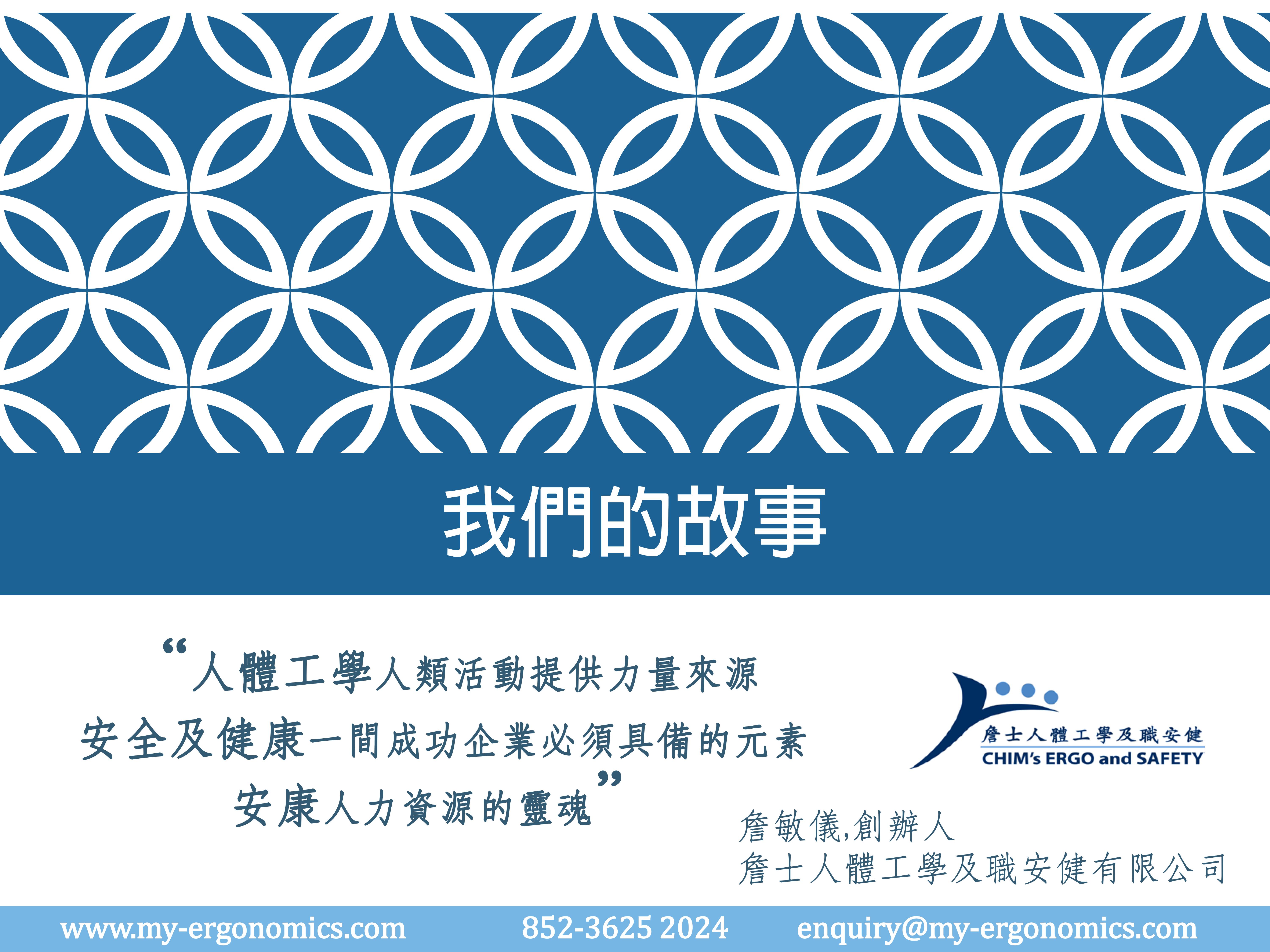 在日常業務及管理中,人體工學、安全與健康及僱員之健康都扮演著非常重要的角色。每位僱主應有責任給予僱員一個安全及健康的工作環境。