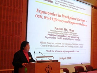 April 2010: Seminar Presentation “Ergonomics in Workplace Design ‐ Occupational Health and Safety, Work Efficiency and Employee Wellness” in the Work Injury & Rehabilitation: An Interdisciplinary Symposium on Musculoskeletal Injury Management at the Workplace” symposium, Department of Orthopaedics & Traumatology, The Chinese University of Hong Kong, and Co‐organized by Hong Kong Workers' Health Centre.