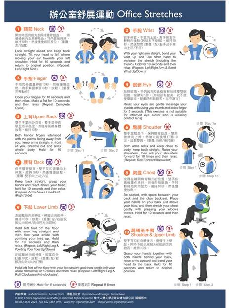 The Office Stretches Poster/Leaflet included 10 office stretching exercise with full explanation and printed in Chinese and English. The office stretches were designed to cover the following body parts: