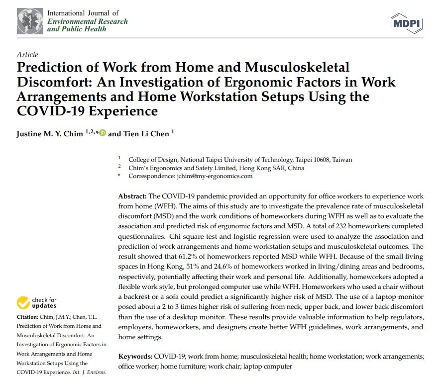 Our Principal Consultant, Ms. Justine Chim, published an article to share the research on the work from home and musculoskeletal discomfort for office employees in Hong Kong.