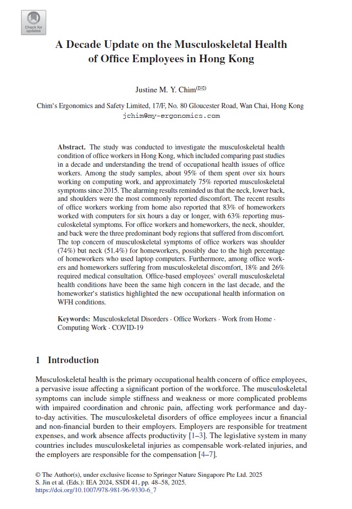 Chim, J.M.Y. (2025). A Decade Update on the Musculoskeletal Health of Office Employees in Hong Kong. In: Jin, S., Kim, J.H., Kong, YK., Park, J., Yun, M.H. (eds) Proceedings of the 22nd Congress of the International Ergonomics Association, Volume 3. IEA 2024. Springer Series in Design and Innovation, vol 41. Springer, Singapore. https://doi.org/10.1007/978-981-96-9330-6_7