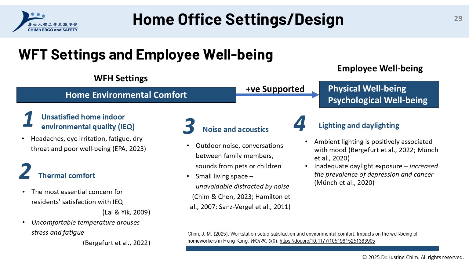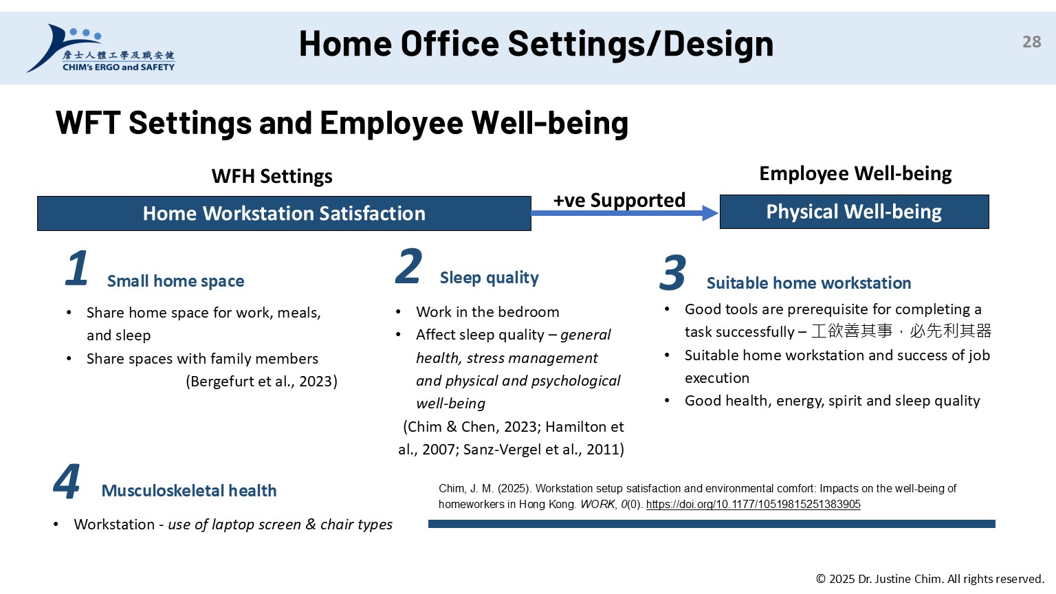 Chim, J. M. (2025). Workstation setup satisfaction and environmental comfort: Impacts on the well-being of homeworkers in Hong Kong. WORK: A Journal of Prevention, Assessment & Rehabilitation, 0(0). https://doi.org/10.1177/10519815251383905